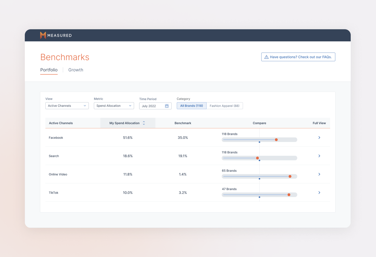 Growth is a way to assess whether the brand you manage is outspending your peers on Facebook, TikTok, Catalog, or other channels, using aggregated, anonymized spend data and rankings from the top-performing brands in your industry.