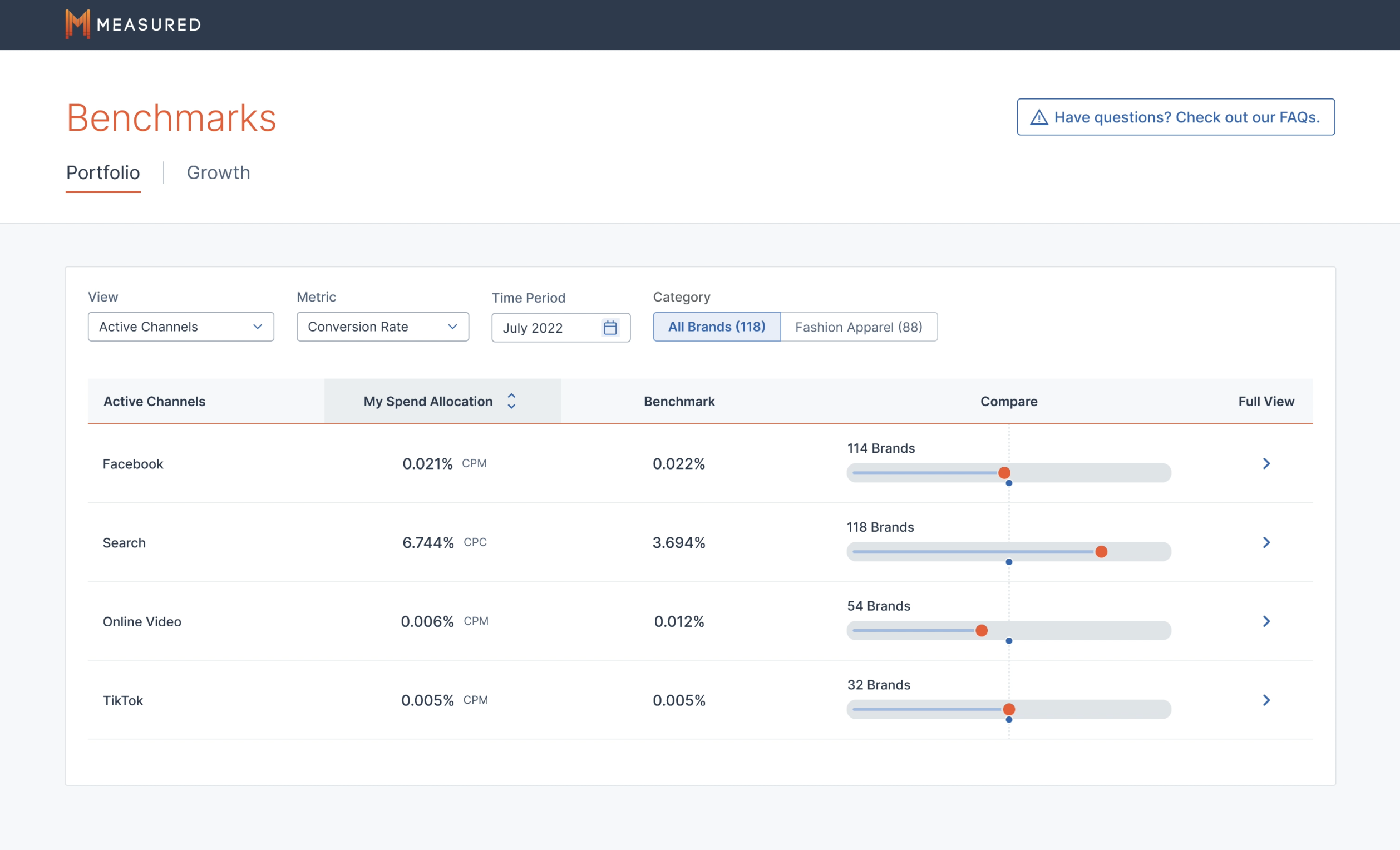 Growth is a way to assess whether the brand you manage is outspending your peers on Facebook, TikTok, Catalog, or other channels, using aggregated, anonymized spend data and rankings from the top-performing brands in your industry.