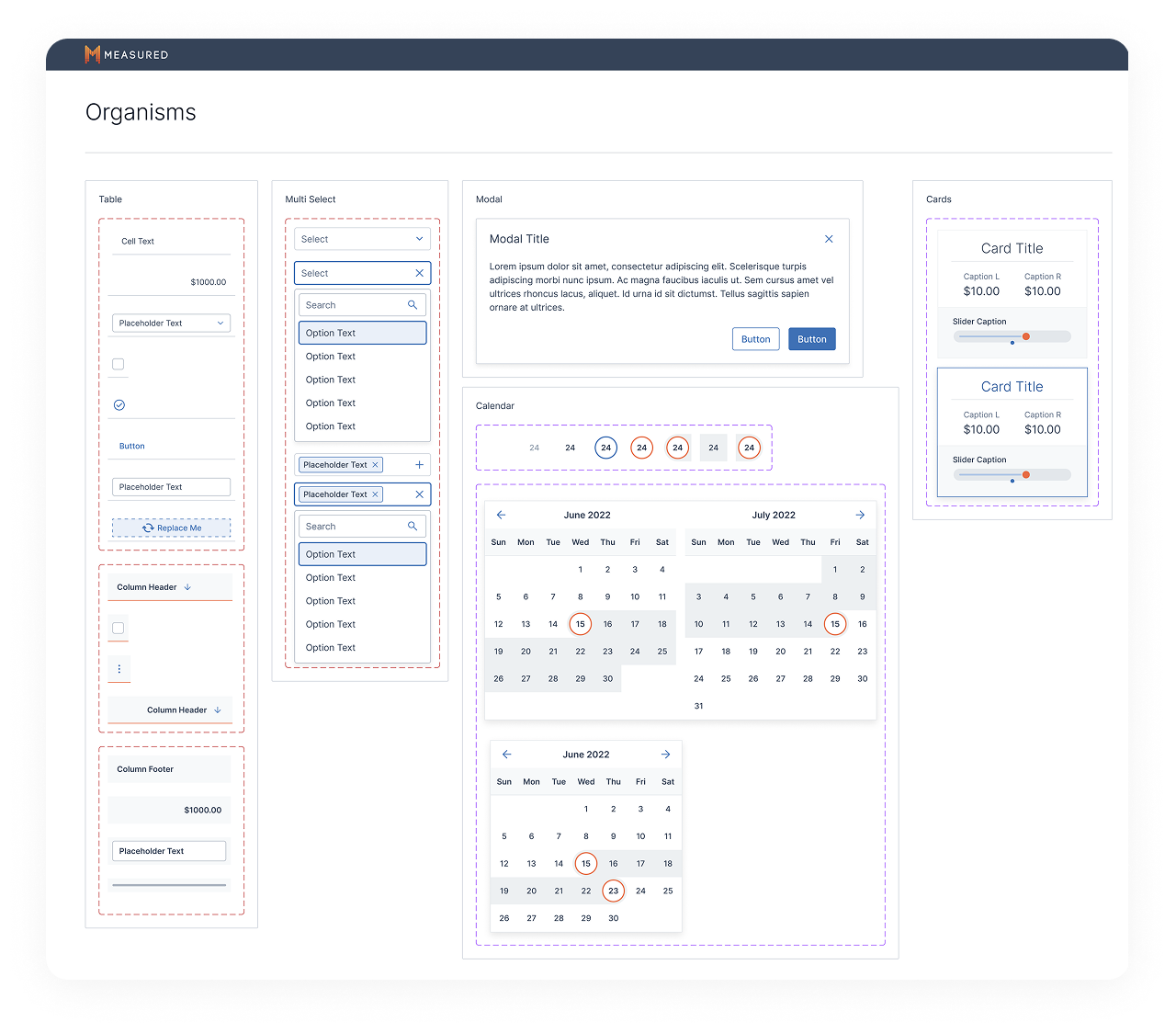 Each foundational element, like an atom, molecule, or template, was built with the proper variables set within Figma, allowing them to be connected to the external files within each of the flows.